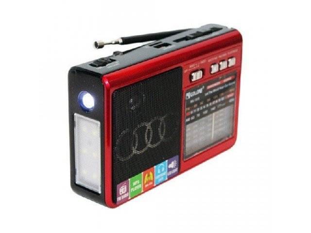 Модель портативного радио фирмы Golon RX 1313 представляет собой небольшой радиоприёмник, который может воспроизводить радиочастоты FM и AM в диапазонах от 88 до 108 МГц и 53-171 КГц соответственно. Данная модель помимо всего прочего поддерживает воспроизведение аудио с карт памяти стандарта USB и TF. Для комфортного прослушивания радио и мр3 плеера вы с лёгкостью сможете подключить наушники через аудио выход (AUX). Кнопки для переключения и остановки на паузу находятся на передней верхней части панели устройства. На боковой части радиоприёмника есть два фонарика, на тот случай если вдруг возникнут перебои с освещением, или вы отдыхаете за городом на природе.Приятным дополнением к модели RX 1313S является то, что она дополнительно комплектуется солнечной панелью 5 В, мощностью 5 Вт. С её помощью можно подзаряжать внутренний аккумулятор Li-Ion 3.7 V.