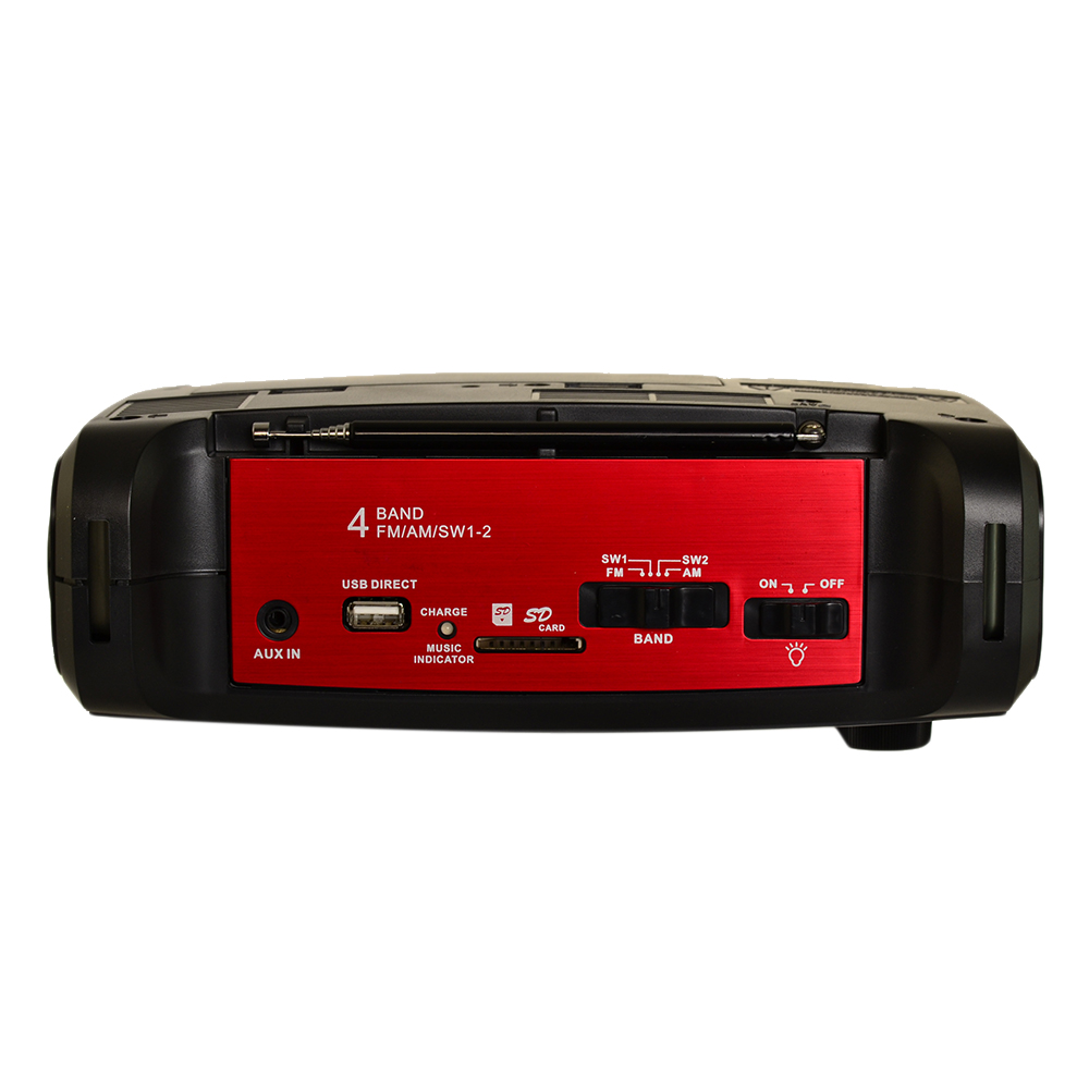 Кнопки на панели позволяют переключать композиции или поставить на паузу. Можно ловить радиостанции на коротких и ультракоротких волнах: FM, SW, AM.Питание – встроенный аккумулятор, либо электросеть 220В, или же 4 батарейки. Длинная телескопическая антенна обеспечивает качественный прием радиостанций. Есть встроенный фонарик с отдельным выключателем.