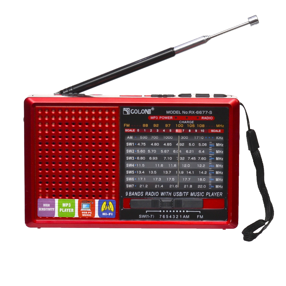 Радиоприемник Golon RX-BT6677-S - это портативное устройство, которое можно взять с собой в дорогу, на дачу или просто слушать дома. Устройство работает от батареек и от солнечной батареи, Воспроизводит аудиофайлы в формате MP3. Компактный и достаточно функциональный, на корпусе расположена ручка для переноса и телескопическая антенна. Приемник принимает 5 волн: AM, FM, SW1 - 7 Поддержка радио: FM диапазон: 64 - 108 МГц, TV диапазон: 2 - 5 канал, AM диапазон: 530 - 1600 КГц, SW диапазон: 7.5 - 190 МГц Поддержка носителей памяти: USB накопители,micro SD карты памяти