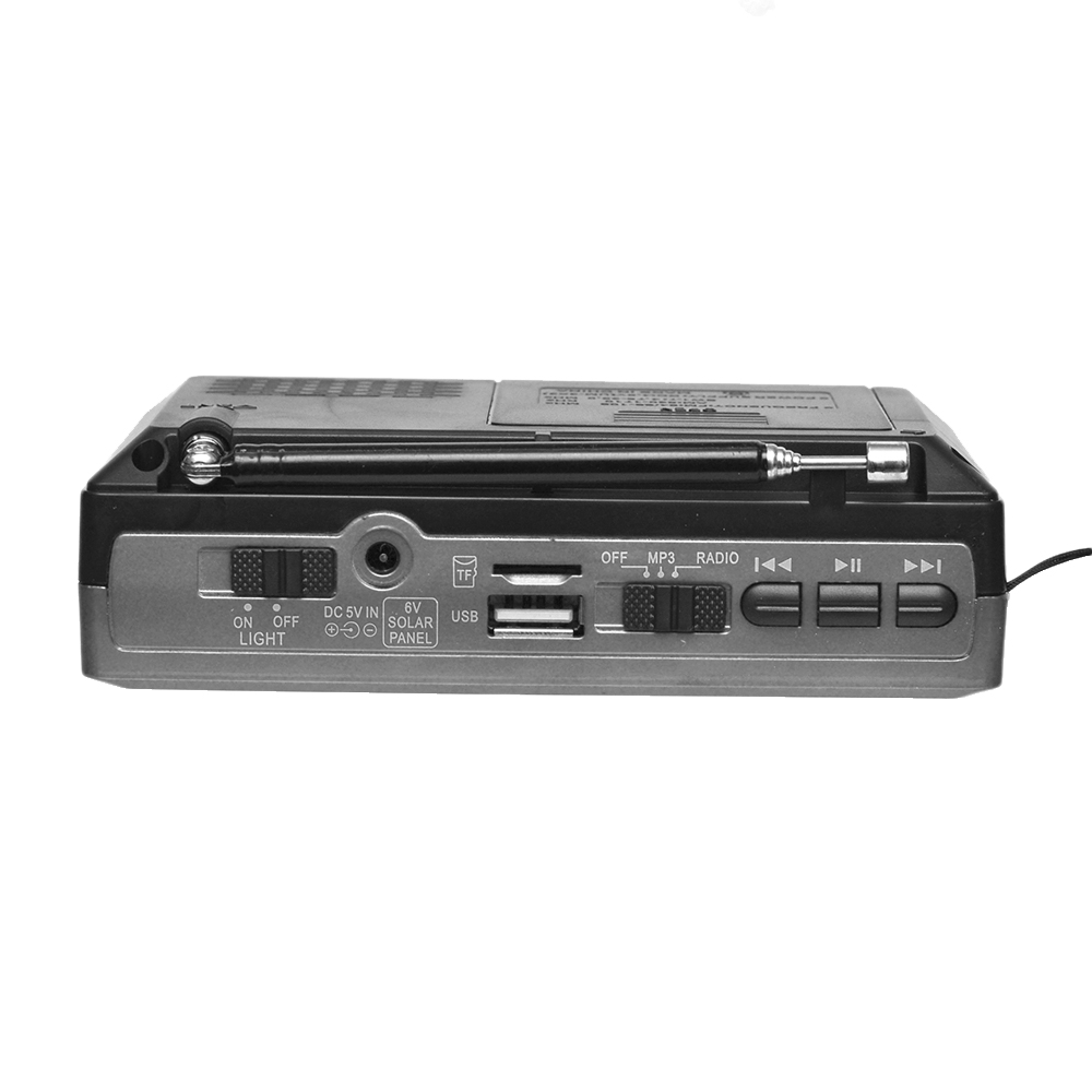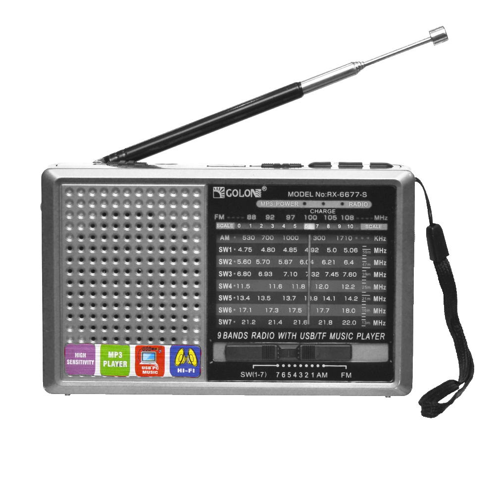 Радиоприемник Golon RX-BT6677-S - это портативное устройство, которое можно взять с собой в дорогу, на дачу или просто слушать дома. Устройство работает от батареек и от солнечной батареи, Воспроизводит аудиофайлы в формате MP3. Компактный и достаточно функциональный, на корпусе расположена ручка для переноса и телескопическая антенна. Приемник принимает 5 волн: AM, FM, SW1 - 7 Поддержка радио: FM диапазон: 64 - 108 МГц, TV диапазон: 2 - 5 канал, AM диапазон: 530 - 1600 КГц, SW диапазон: 7.5 - 190 МГц Поддержка носителей памяти: USB накопители,micro SD карты памяти