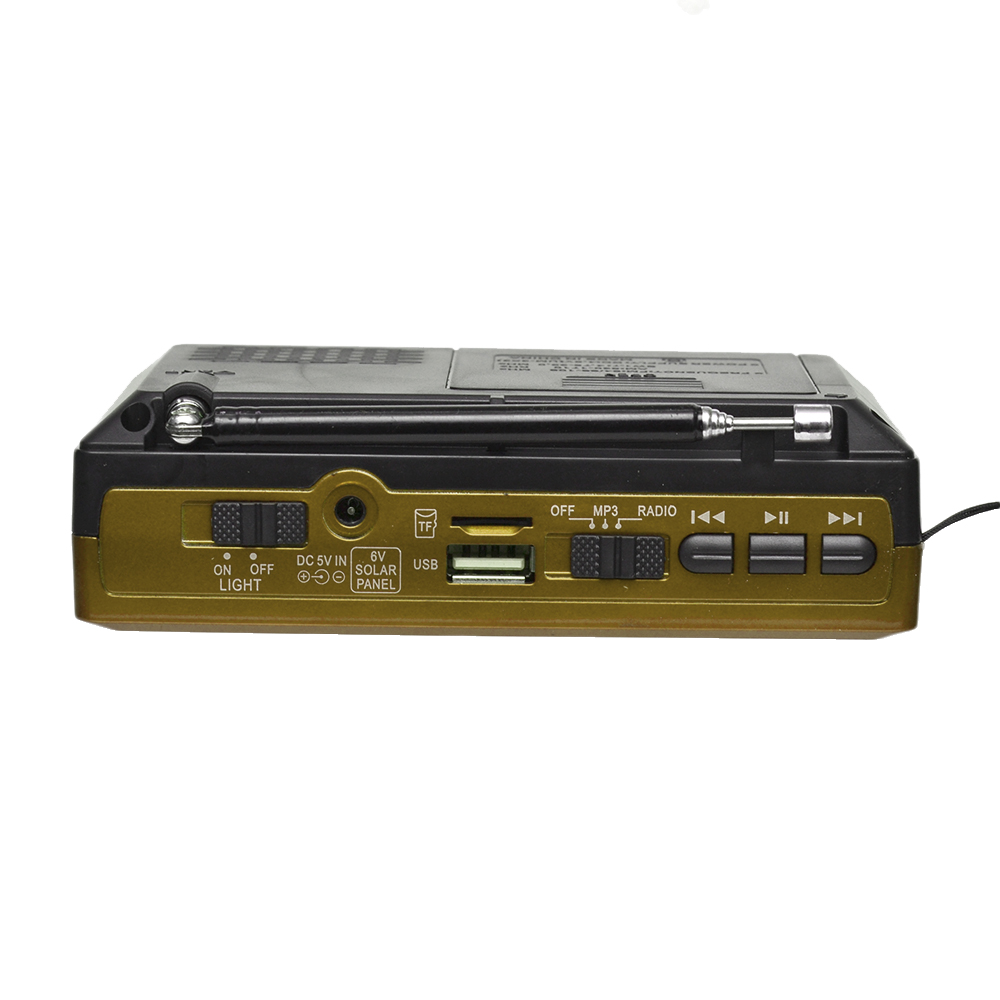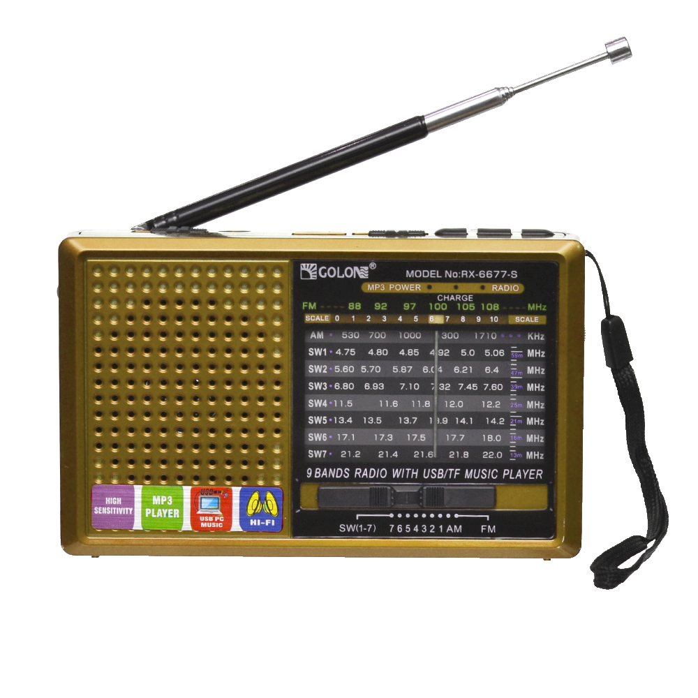 Радиоприемник Golon RX-BT6677-S - это портативное устройство, которое можно взять с собой в дорогу, на дачу или просто слушать дома. Устройство работает от батареек и от солнечной батареи, Воспроизводит аудиофайлы в формате MP3. Компактный и достаточно функциональный, на корпусе расположена ручка для переноса и телескопическая антенна. Приемник принимает 5 волн: AM, FM, SW1 - 7 Поддержка радио: FM диапазон: 64 - 108 МГц, TV диапазон: 2 - 5 канал, AM диапазон: 530 - 1600 КГц, SW диапазон: 7.5 - 190 МГц Поддержка носителей памяти: USB накопители,micro SD карты памяти
