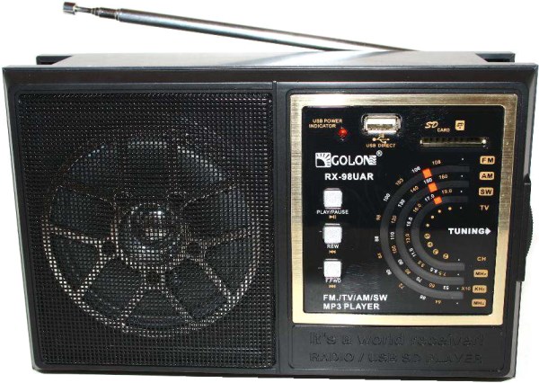 Портативная аккустическая система GOLON RX-98UAR, имеет встроенный аккумулятор, благодаря ему, вы сможете слушать любимую музыку c USB флешки, карты памяти SD, FM радио, на даче, на отдыхе, вдали от розетки. На дисплее отображается FM частота, номер трека. Корпус сделан из пластика, легко носить с собой. Есть 3 варианта питания: встроенный аккумулятор (до 8 часов), батарейки R20 4шт, от сети 220В (шнур в комплекте), от него же из заряжается встроенный аккумулятор.