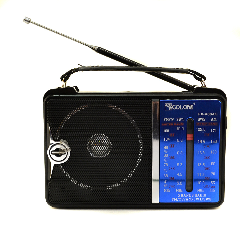 Радмоприёмник Golon RX-A06AC можно взять с собой в поездку, на пикник, кемпинг, в командировку, или слушать дома, на даче. Golon RX-A06AC отличный вариант компактного музыкального радиоустройства. В приемнике Golon RX-A06AC есть возможность выбора питания, колонка может работать от электросети 220В или от двух батареек (не идут в комплекте). Радиоприемник MP3 Golon RX-A06AC ловит короткие и длинные радиоволны, в широком частотном диапазоне. На пластиковом корпусе имеются колесики для поиска радиостанции и настройки громкости звучания. Длинная телескопическая антенна обеспечивает качественный прием радиостанций. Корпус приемника изготовлен из черного глянцевого пластика. Также присутствует ручка для переноса прибора.