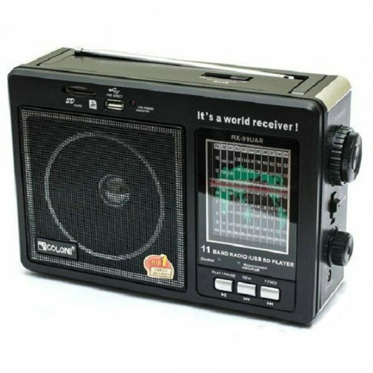 Портативная аккустическая система GOLON RX-98UAR, имеет встроенный аккумулятор, благодаря ему, вы сможете слушать любимую музыку c USB флешки, карты памяти SD, FM радио, на даче, на отдыхе, вдали от розетки. На дисплее отображается FM частота, номер трека. Корпус сделан из пластика, легко носить с собой. Есть 3 варианта питания: встроенный аккумулятор (до 8 часов), батарейки R20 4шт, от сети 220В (шнур в комплекте), от него же из заряжается встроенный аккумулятор.